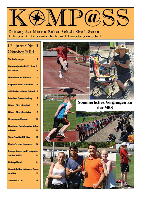 So enthält unsere Schulzeitung viele Artikel von unterschiedlichen Mitgliedern der Schulgemeinde. Zur Schulgemeinde gehören Schüler, Eltern, Lehrkräfte und Mitarbeiter. Selbstverständlich bleibt auch Raum für Gastbeiträge und Fremdartikel. Dabei geht es immer um Information, Unterhaltung, Meinung und Kritik. Auf der letzten Seite steht im Impressum, wann in diesem Kalenderjahr die nächsten KOMPASS-Ausgaben erscheinen werden. Wer den KOMPASS nicht liest, dem entgeht, was an unserer Schule passiert!